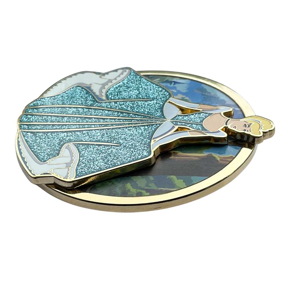 Home By Midnight This is a pin on pin design featuring Cinderella in her glittering blue ball gown and smiling with a painted forest background. Size: 3.25" Edition: 200 Each...