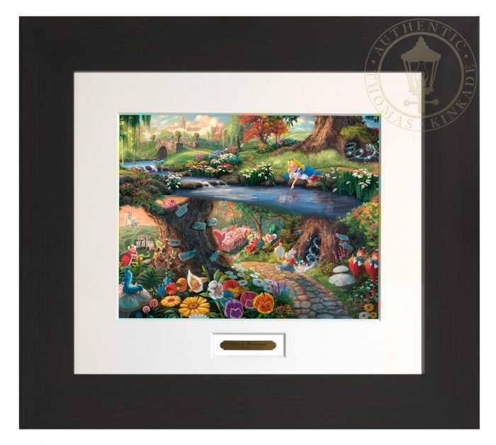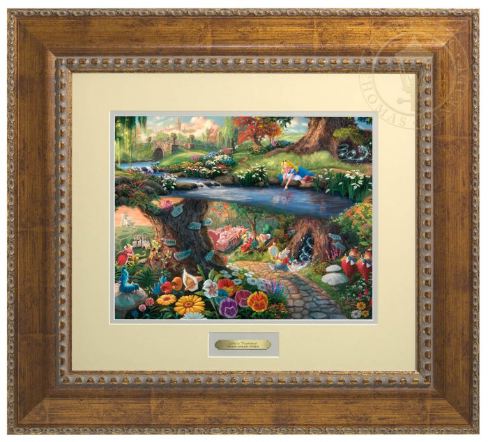 The story tells of a young girl named Alice who accidentally falls down a rabbit hole and finds herself on a curious adventure and in the presence of a number of odd and interesting characters. In 1951, Walt Disney realized a long-held ambition and brought this enchanting tale to the big screen, infusing it with his own brand of animated magic and family fun. Alice in Wonderland as illustrated by John Tenniel was exquisitely detailed in the book, while the Disney film was a modernist style with a highly saturated color palette. The Thomas Kinkade Studios painting of Alice in Wonderland captures all the great Disney characters. The hurried White Rabbit, the enigmatic Caterpillar, the lunatic Mad Hatter, the nonsensical Tweedledee and Tweedledum all play a part in the world down the hole. There is also Alice, viewing it all with a child’s innocence and relating to it in a way that brings out the wonderment in all of us. It is with a great deal of pride that we present the Thomas Kinkade Studios painting Alice in Wonderland inspired by the literary genius of Lewis Carroll and animated mastery of Walt Disney