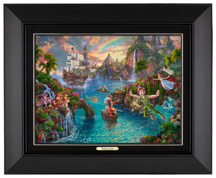 Peter Pan is a classic Disney film that celebrates the magic of childhood. In this tale, Wendy Darling and her brothers Michael and John join Peter Pan, Tinker Bell, and The Lost Boys on an exciting adventure that highlights how important it is to always use our imaginations and that nothing is impossible if we believe in it. The story also reinforces the fact that the power of a friendship can last a lifetime. Peter Pan’s Never Land by Thomas Kinkade Studios captures the adventure of the magical place that Peter Pan and his friends call home. In this scene, we see Peter battling his nemesis Captain Hook, with the help of Wendy, Michael, John, The Lost Boys, and his beloved pal Tinker Bell. The friends fly together with faith and a dash of pixie dust, while the Mermaids look on and a beautiful rainbow sits brightly in the sky. This painting reminds us that although we may grow up, we should view the world with the wonderment of a child, no matter our age. It also reinforces the fact that the bonds of a true friendship can lift us up throughout our lives.
