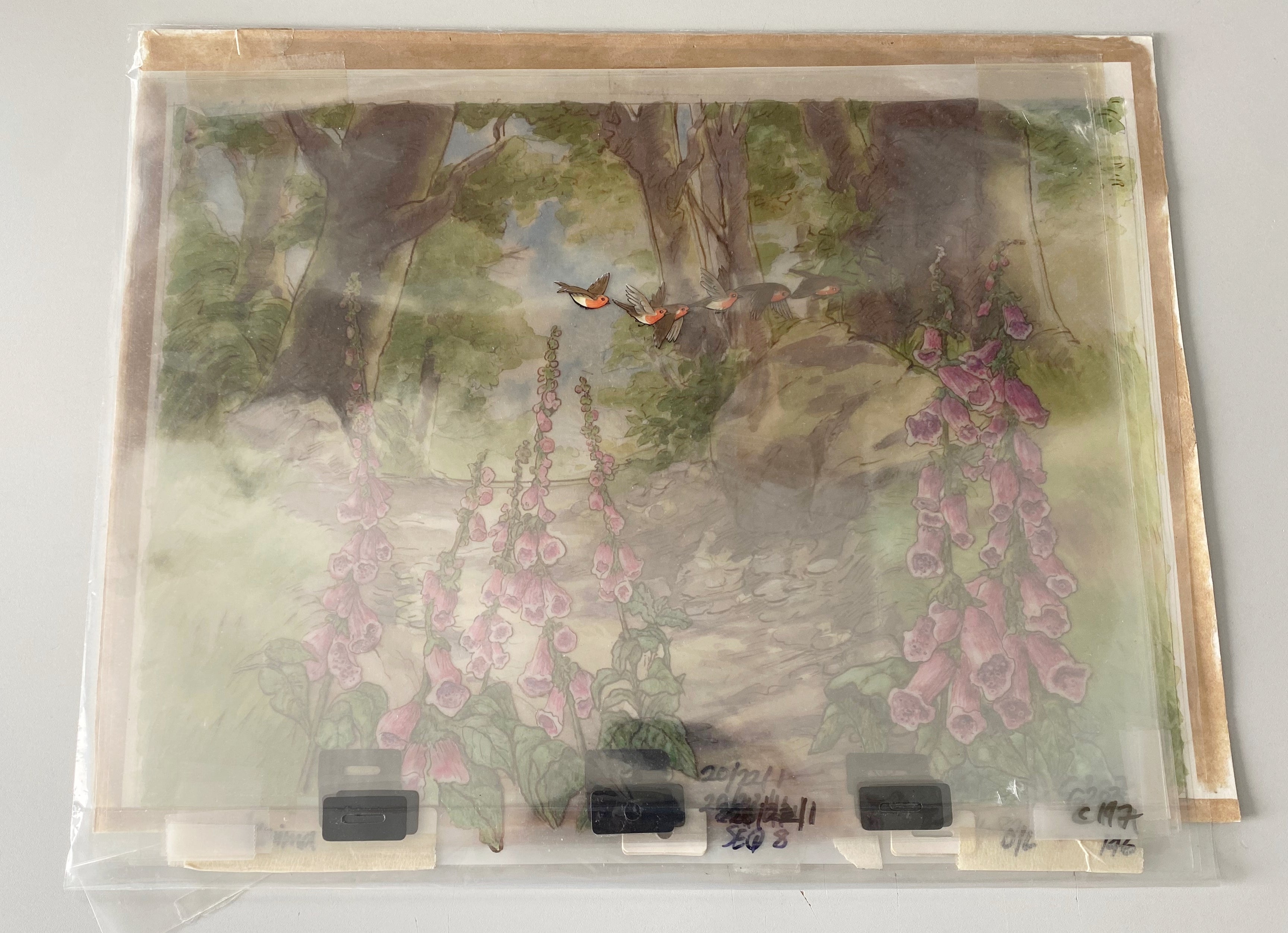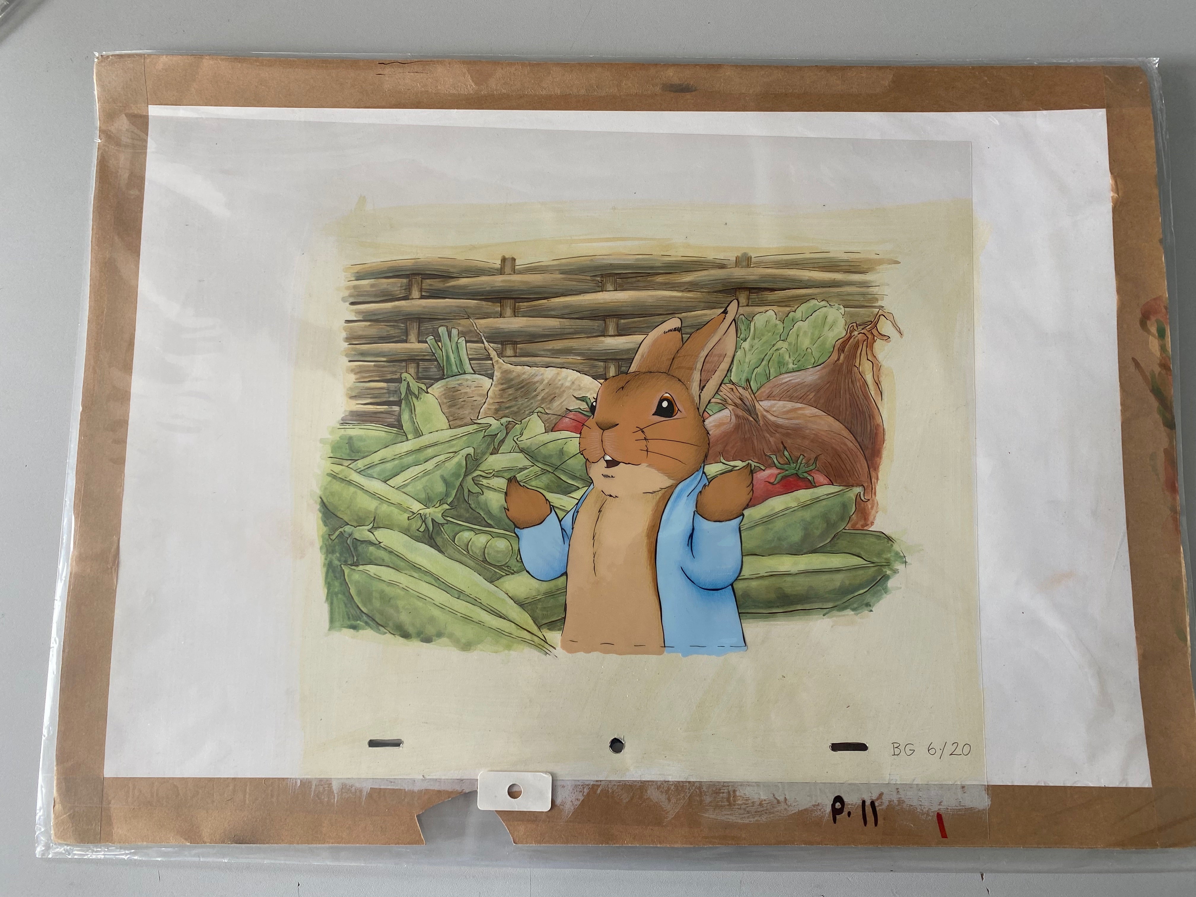 This cel was used in the production of the animated movie Peter Rabbit which premiered in 1991. These original production backgrounds are created using gouache and watercolour. Size: 29" x 26" Certificate...