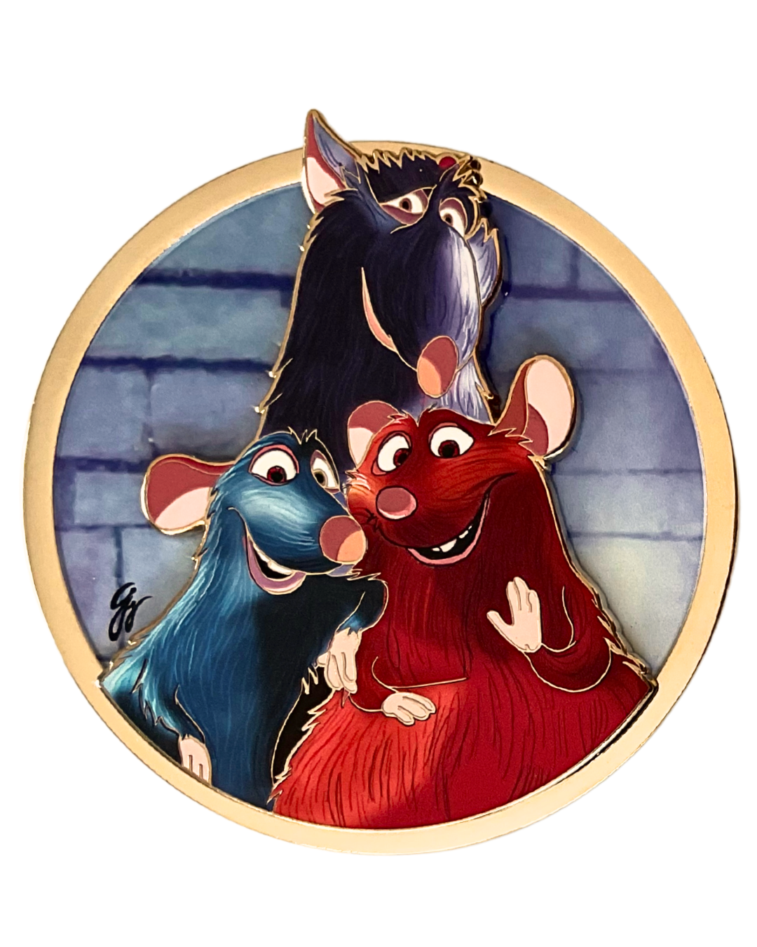 Anyone Can Cook is our first pin of Alfredo Linguini with his best rat-friend Remy! This pin is a Signature pin and has Guy Vasilovich's screen printed signature on the background. This is a pin on pin design with Alfredo smiling and watching Remy chef's kiss as a pin layer on top of a pink starry background.